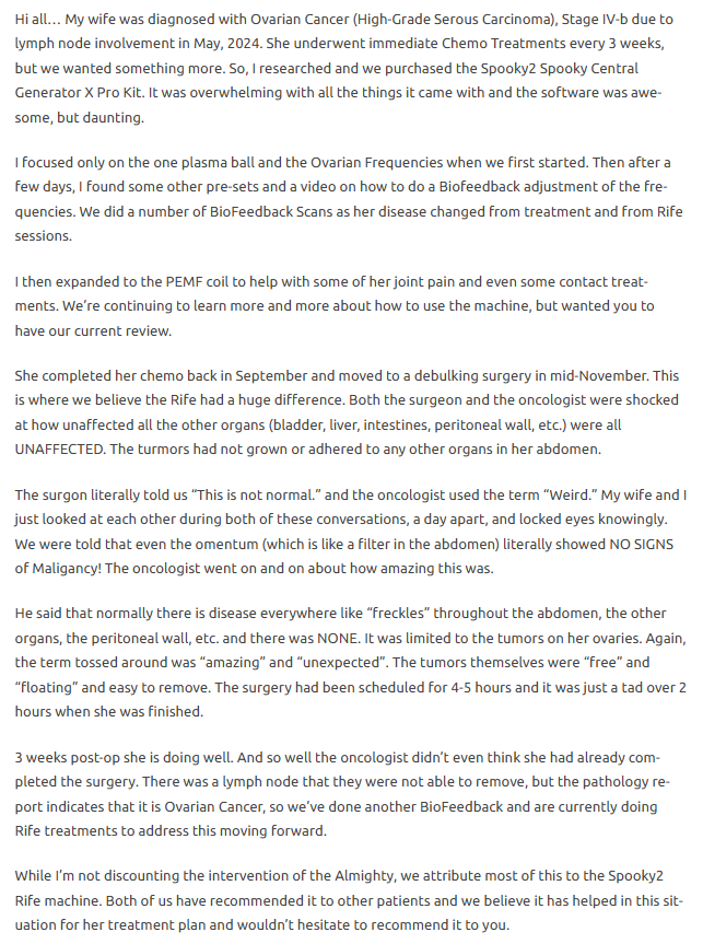 The user described using Spooky2 alongside ongoing care during an ovarian-related health situation. They explored multiple system modes over time, including Plasma, Contact, Biofeedback scans, and PEMF. During surgery, medical professionals reportedly noted that surrounding organs and tissues appeared unaffected, which the user described as unexpected. The user expressed strong personal confidence in Spooky2 as a supportive tool.
