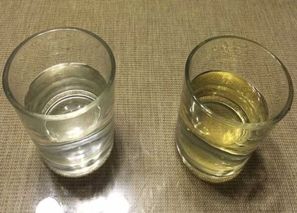 There are visible differences between colloidal silver and ionic silver. These drinking glasses contain two different batches of silver solution, each with roughly 15ppm silver concentration. The glass on the left was made using the old-fashioned direct current (battery) method. It has a high ionic content, no color, and is clear. Adding salt, however, will make it turn cloudy as the silver ions convert to silver chloride. The glass on the right has a high colloidal content and a golden hue. Adding salt will not alter its clarity. It was created over two days using very low current and the special Spooky2 waveform.