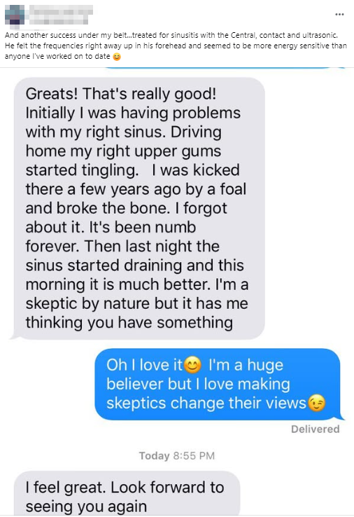 Spooky2 Central’s Contact and Ultrasonic modes helped a user relieve sinusitis symptoms, providing immediate relief in the forehead area.