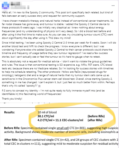 A user reported a noticeable improvement in their health after using Spooky2 Central, with a significant decrease in abnormal cell markers after six weeks of treatment as part of their natural healing protocol.