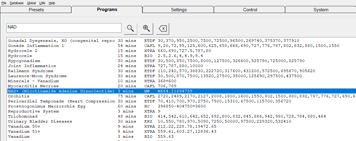 One Spooky2 user, Marie Elizabeth, shared that she frequently runs NAD-related frequency programs as part of her anti-aging protocol. NAD (Nicotinamide Adenine Dinucleotide) is a key protein involved in cellular energy production and DNA repair, which naturally declines with age.