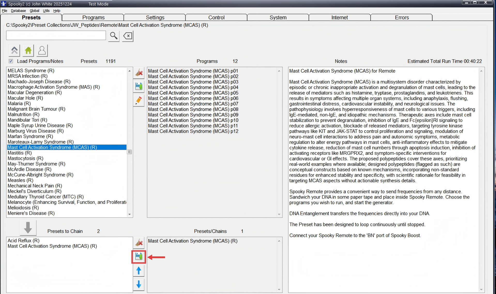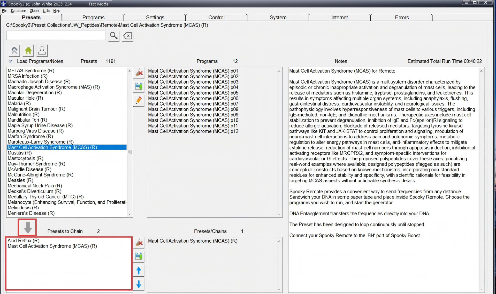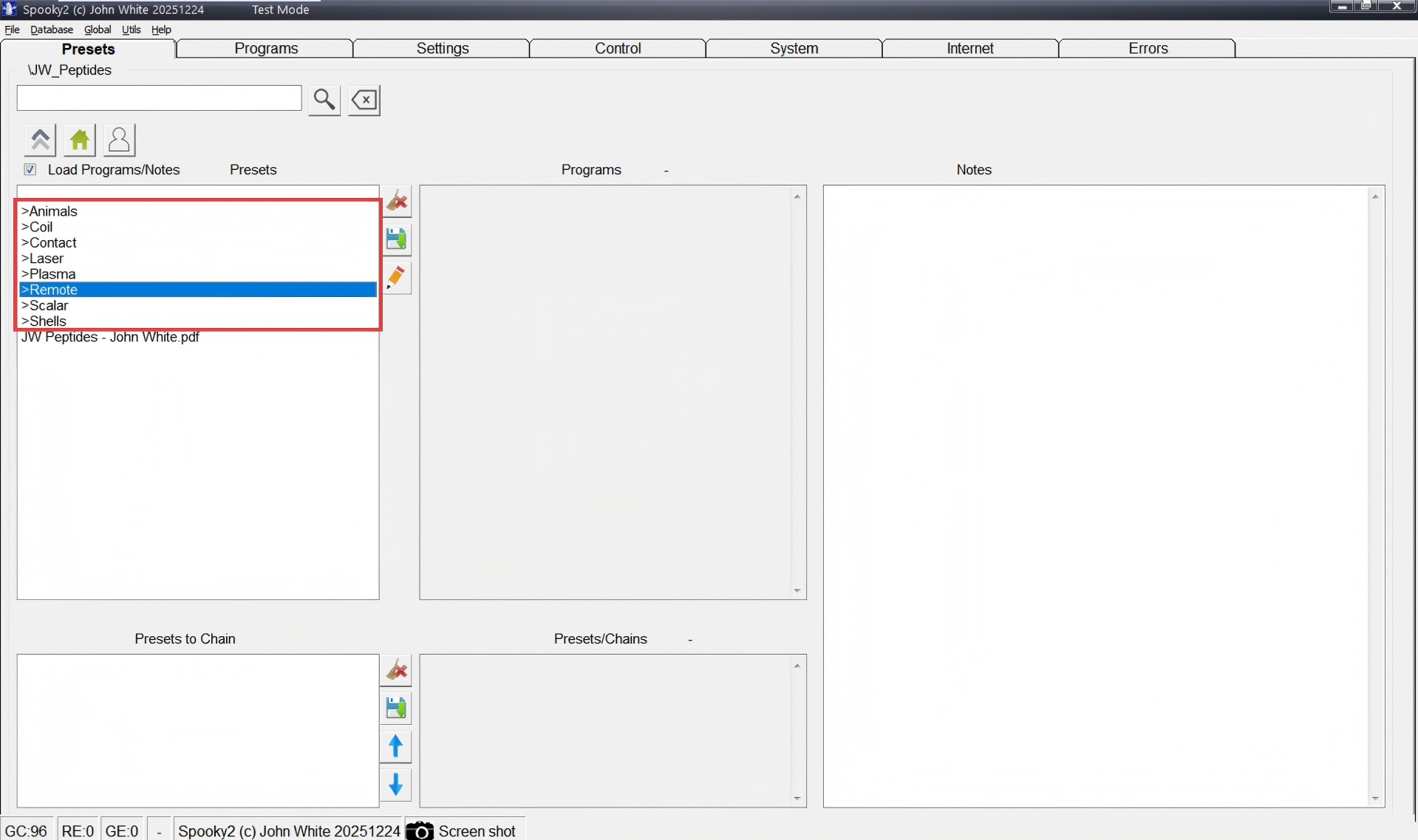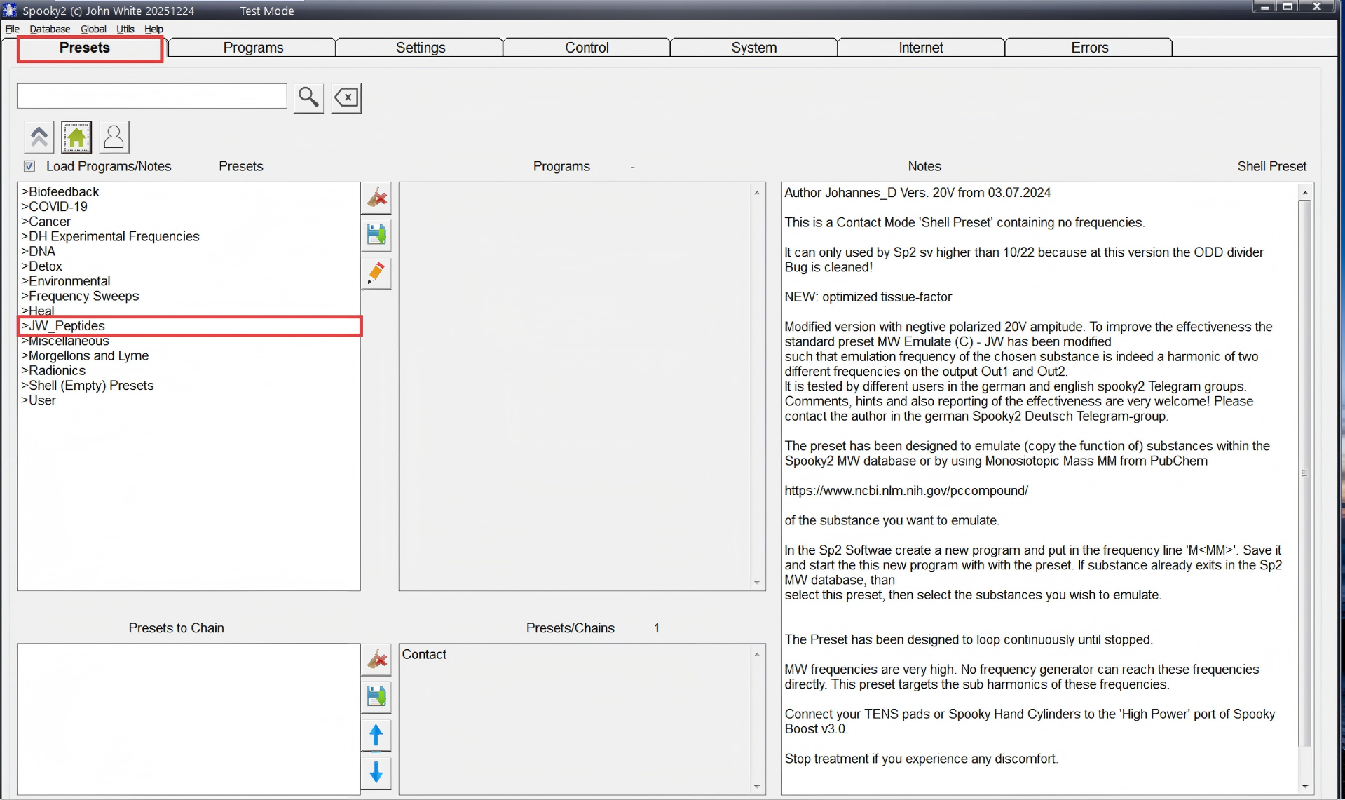 In the Spooky2 software, navigate to the PRESETS tab, choose JW_Peptides from the