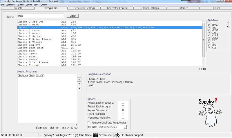 In the database are frequencies for the chakras – based on 432 Hz. They were derived from the sounds of Tibetan Singing Bowls and given additional weight by the following analsysis: