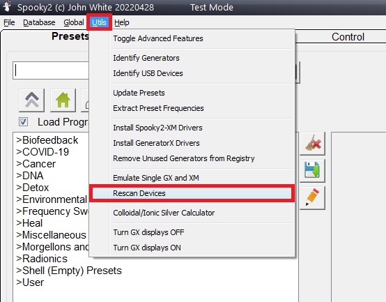 Spooky2 XM has only one port, so it is easy to find its port number. If you want to use multiple XMs at the same time, we suggest you connect them one by one. After one generator is identified, you can make a note on it. Then connect the next one, and click Rescan Devices, the new Generator Port Number that appears on the screen will be the second XM.