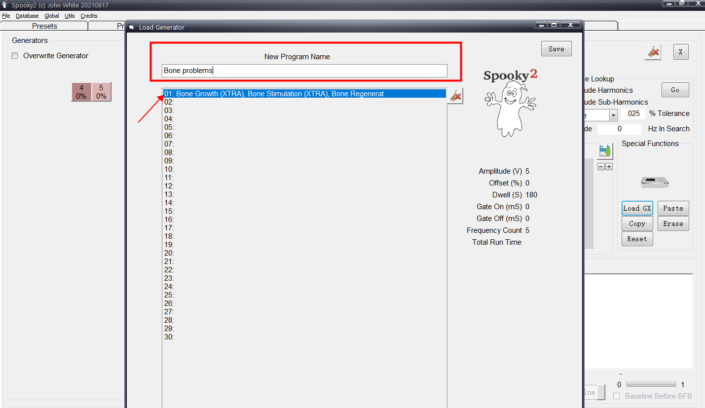 Below “New Program Name”, give the new program a name so that you can remind yourself what this program is about. If not, it will automatically combine all your program names as titles. Here, l name the program “Bone problems”. Double click on the location you want the program to be stored. You can overwrite an existing program if you like. There are 30 locations which you can store your programs. However, all of these programs should be within the limits of 200 frequencies. Here, l will place them in Location 01.