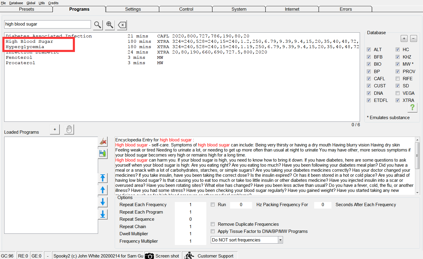 To get started, we recommend using the Shell (Empty) Preset > Plasma. Then, go to the Programs tab and search for keywords like “diabetes” or “blood sugar” to select suitable frequency programs.