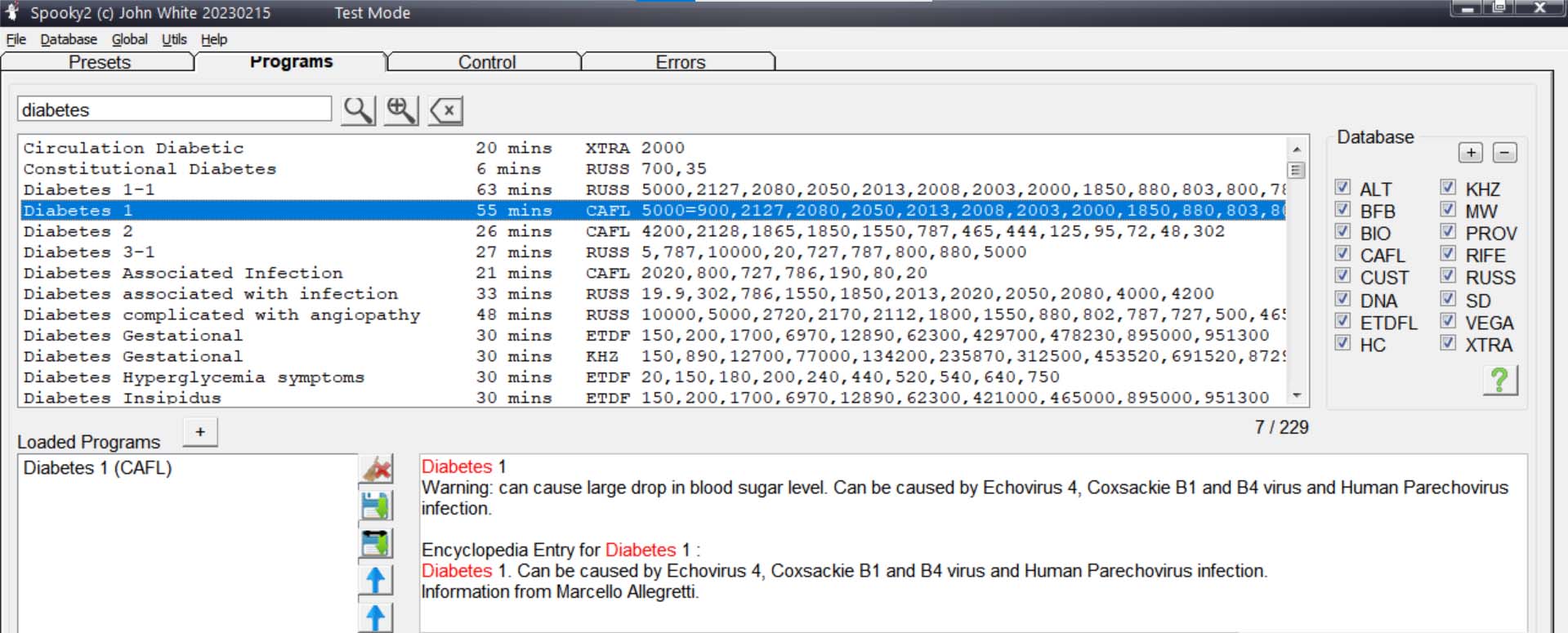 If you cannot find a condition in the Presets tab, you can choose a shell preset and search for programs under the Programs tab by entering your condition name. There are over 60,000 programs in the Spooky2 software database, and you can definitely find suitable ones.