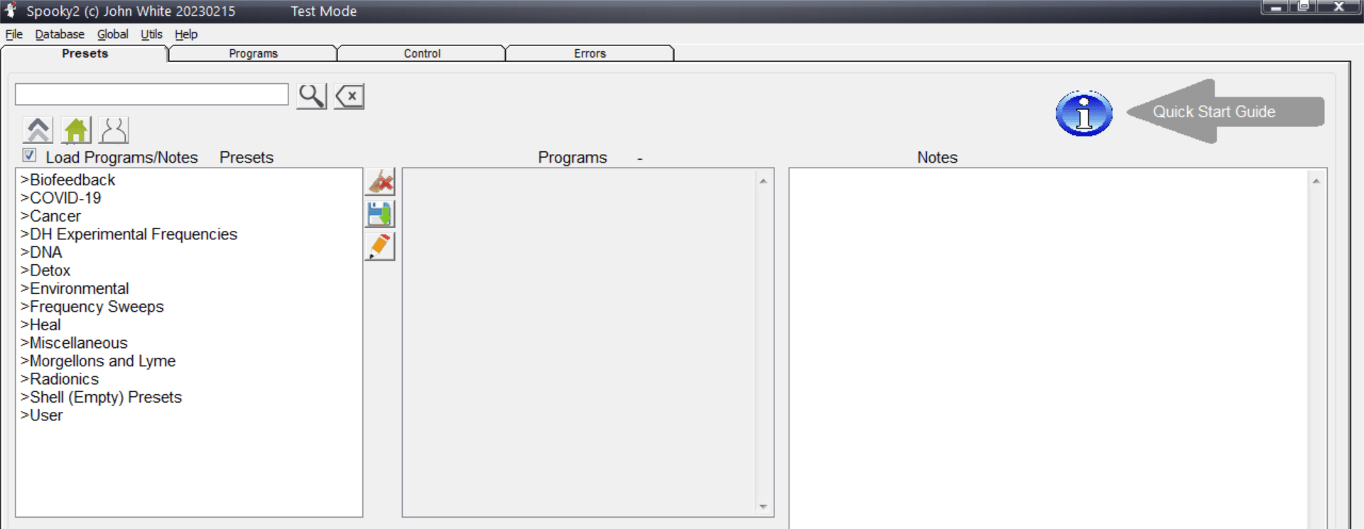 A preset is a list of programs with appropriate settings built by the Spooky2 team or yourself when you save a user preset. There are two types of presets. One is factory preset, which includes programs and settings. The other one is a shell (empty) preset containing only settings. You can choose a factory preset and then go straight to the Control tab to run it without any adjustment. But If you select a shell preset, you need to choose the programs you want and then go to the Control tab to run them.