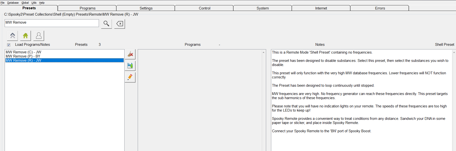 💡 If contrast dye was used during your scan, you can support your body by running a matching detox frequency. In the Spooky2 software, go to the Preset Tab and follow this path: Preset Collections > Shell (Empty) Presets > Remote > MW Remove (R) – JW