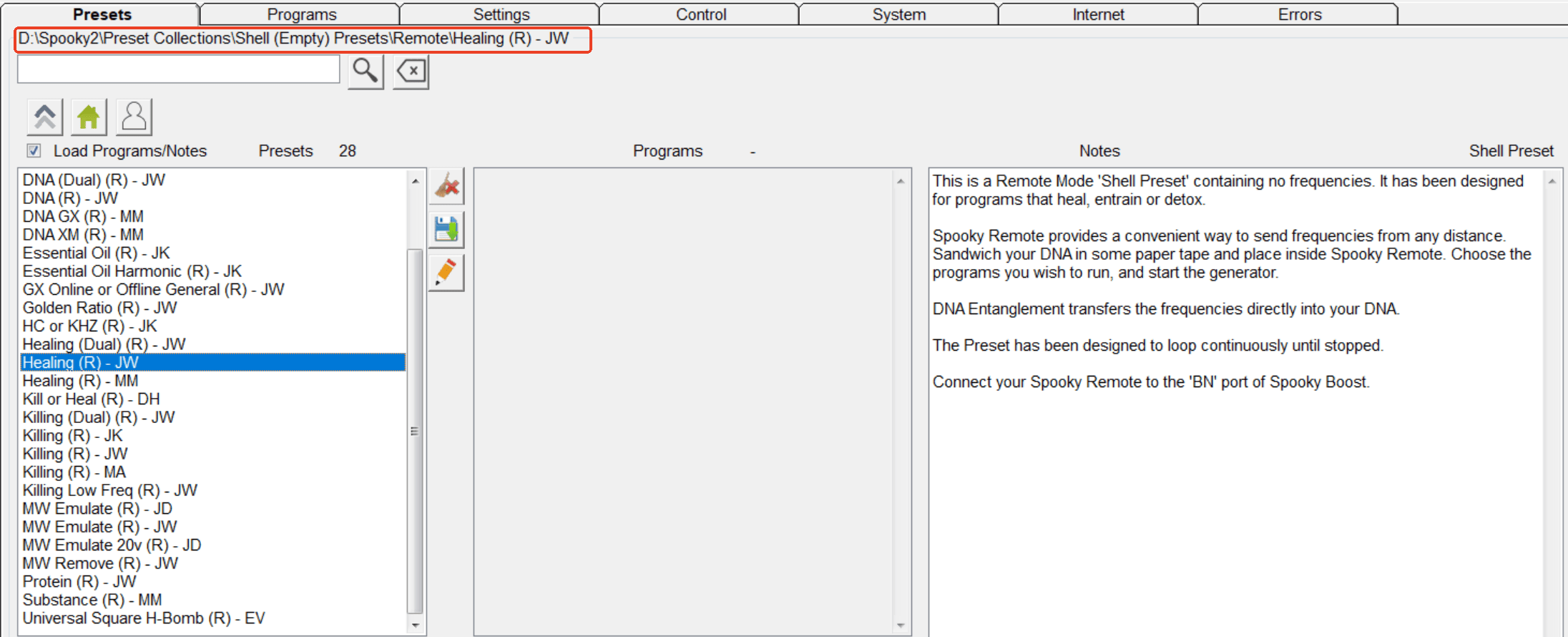 Open your Spooky2 software and choose Shell (Empty) Presets > Remote > Healing (R) – JW.