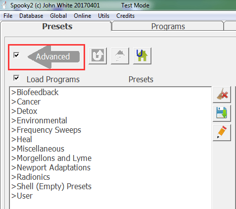 Spooky2 software has two modes, simple mode and advanced mode. Simple mode has Presets tab, Programs tab, Control tab and Errors tab. Advanced mode has Presets tab, Programs tab, Settings tab, Control tab, System tab, Internet tab and Error tab. You can switch between them by ticking the Advanced here.