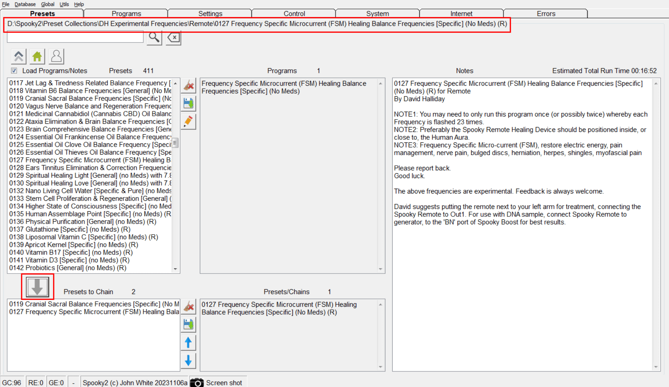 2. Create Presets to Chain: Click 0119 Cranial Sacral Balance Frequencies [Specific] (No Meds) (R) and Click the downward arrow on the left side of presets to chain, Click 0127 Frequency Specific Microcurrent (FSM) Healing Balance Frequencies [Specific] (No Meds) (R) for the same method.