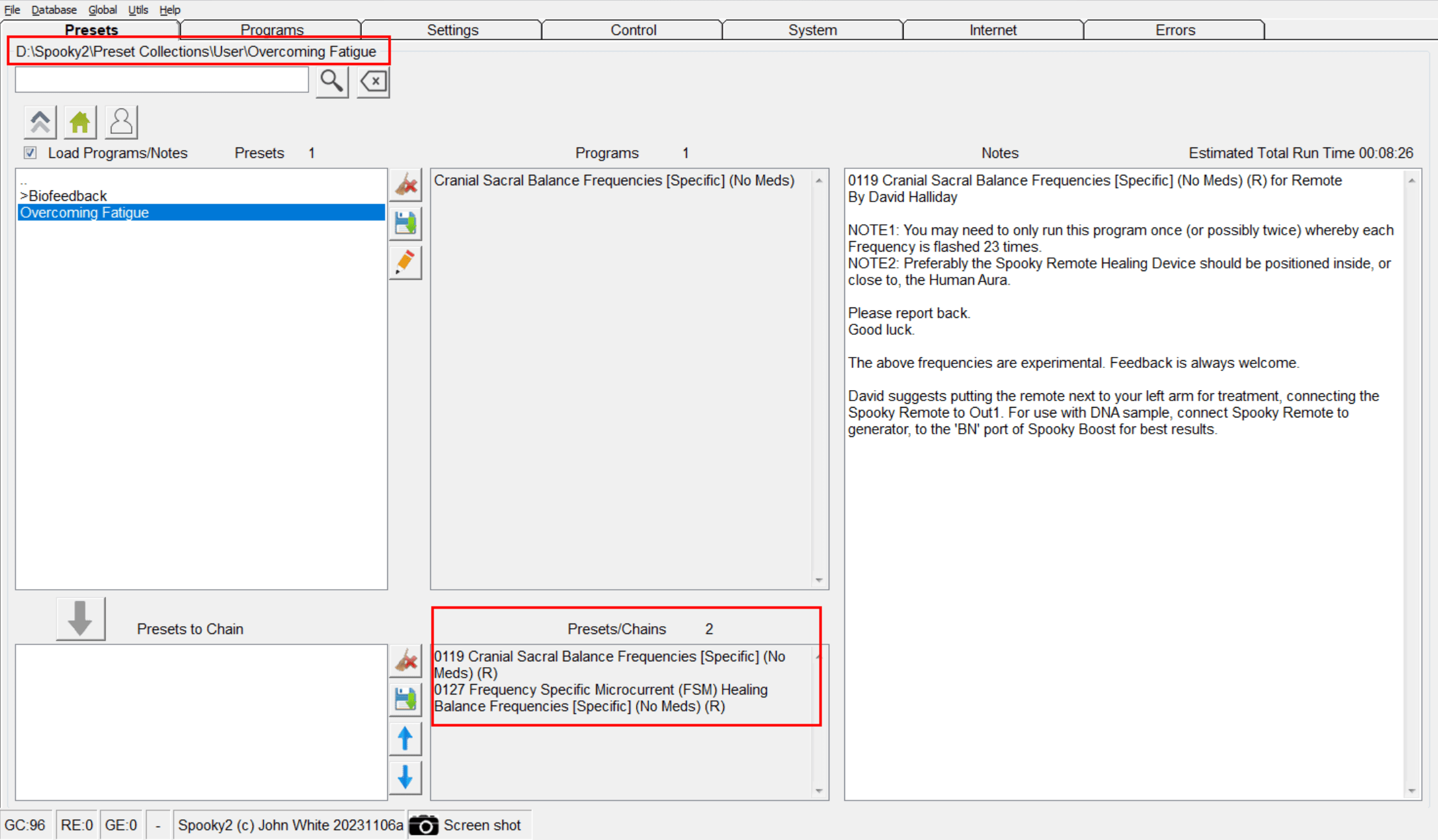 Hello Fabrizio, Thank you for your interest in the setups mentioned by Jure! From the conversation details you’ve provided, it appears Jure is using two different preset chains. Here is the original post. https://www.facebook.com/groups/spooky2/posts/2263541573807733/ The first preset chain combines DH 119 + 127, and the second chain involves DH 127 + 65 + 100, which is indeed run on two generators in parallel.