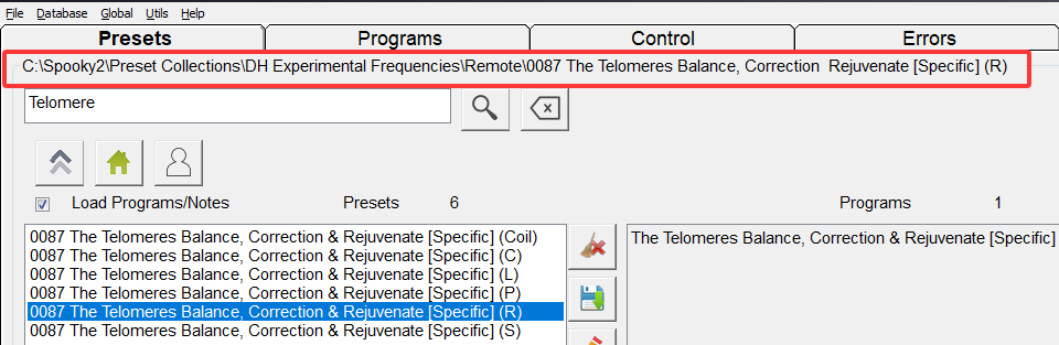 Hello Ola, To find the telomere option, please search in the Presets tab (not Programs) for “Telomere”. You should see it under DH Experimental Frequencies → “Telomeres Balance, Correction & Rejuvenate [Specific] (R)”. Then load it and run in Remote mode as shown in the blog. If you don’t see it, please download the DH presets here: https://www.spooky2.com/downloadspage/