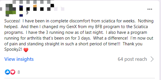 I have been in complete discomfort from sciatica for weeks. I changed my GenX to the Sciatica programs. I’m now out of pain and standing straight in such a short period of time! Thank you Spooky2!
