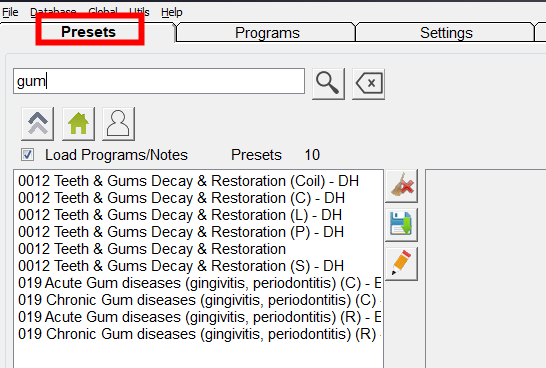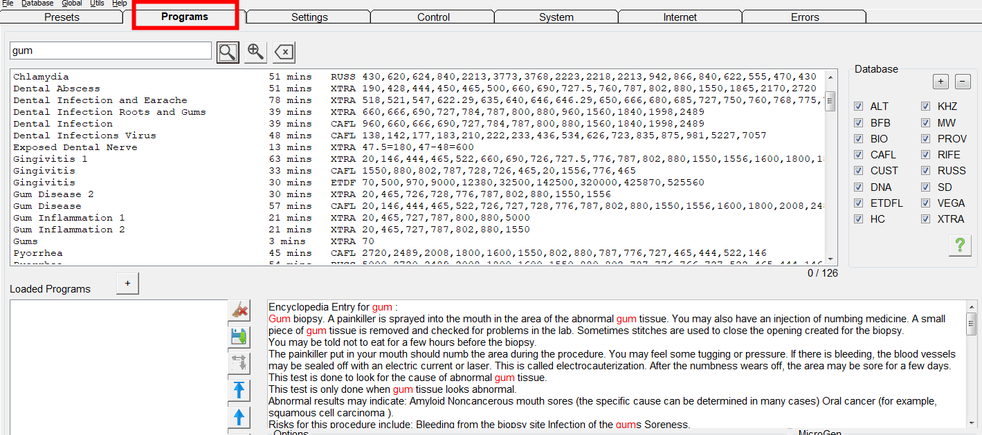 Spooky2 frequency database contains over 35,000 programs dedicated to providing you with accurate and beneficial frequencies for imbalanced energy. Search the keyword “gum” in the Presets/Programs search box, and you will find some presets/programs.