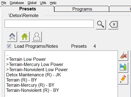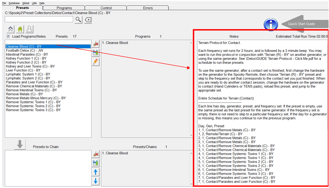After you have successfully installed the Spooky2 software, you can find the Terrain Protocol either in “Detox – Remote – Terrain (R) – BY” or search “terrain” in the search box under the Presets tab.