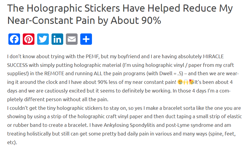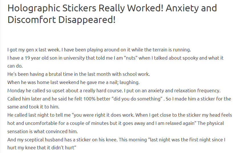 I have also had great success with holographic stickers of various kinds embedded with spooky frequencies. I have shared them with a friend who had breast cancer. She said that the stickers worked as well as frequency embedded organic unfiltered olive oil (which I believe is similar to holy oil which has been “sung over” by Latin speaking priests. The stickers I gave her were embedded with anti cancer frequencies and the stickers came from matrix dot com dot ru. They are skin safe with Italian film. The pattern is the flower of life in the hologram. Spooky is an invaluable tool and the holographic stickers are worth trying for anyone who is suffering.