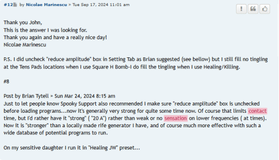In the Spooky2 community, users often share their experiences and feedback, which can be incredibly helpful for those just starting or adjusting their settings. Here’s a comment from one of our users, which serves as a great example of how frequency can influence physical sensations.