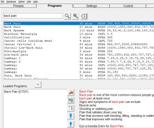 Below “New Program Name”, give the new program a name so that you can remind yourself what this program is about. If not, it will automatically combine all your program names as titles. Here, l name the program “Bone problems”. Double click on the location you want the program to be stored. You can overwrite an existing program if you like. There are 30 locations which you can store your programs. However, all of these programs should be within the limits of 200 frequencies. Here, l will place them in Location 01.